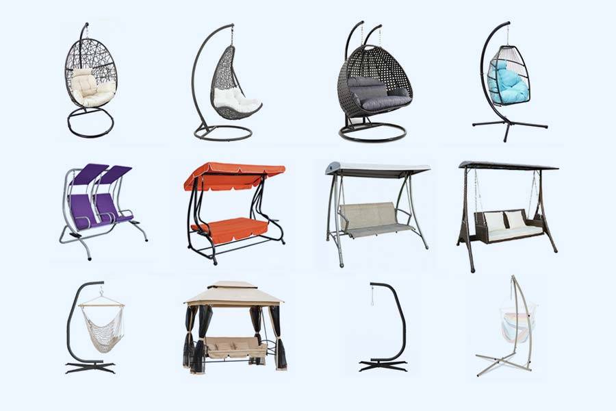 A wide range of outdoor swing chair styles, including 2-person and 3-person patio swing chairs with canopies, wicker porch swings, egg swing chairs, and hammock hanging chairs. Built with durable materials and available in various fabrics, all at factory-direct pricing.