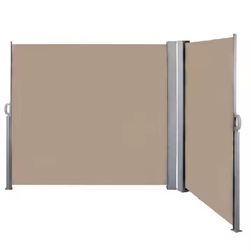 Paravent rétractable double face marron : deux panneaux se déploient en sens opposés pour une large couverture, avec intimité, ombre et protection au vent. Toile polyester 280 g/m² avec enduction PU/PA, résistante aux UV, respirante et facile à nettoyer. Armature aluminium ou acier thermolaqué, conçue pour durer en extérieur.