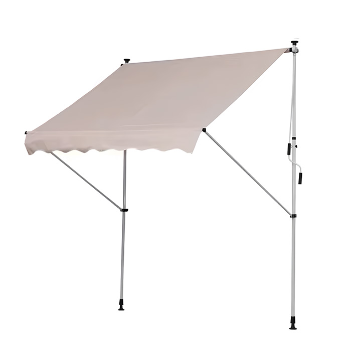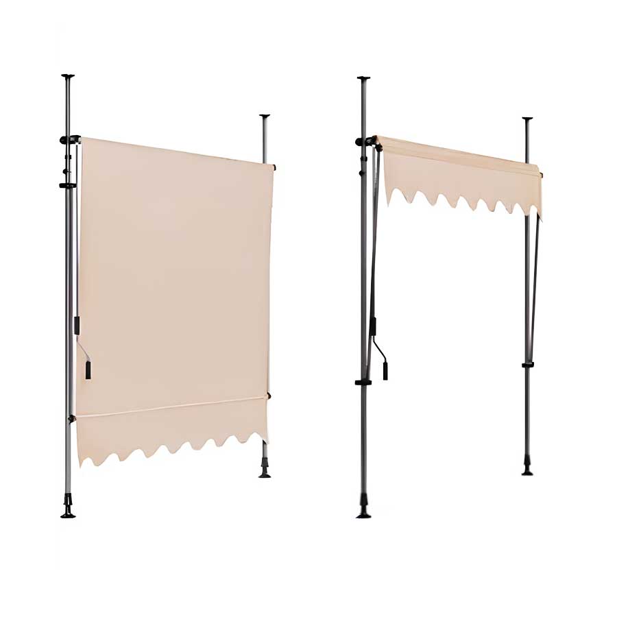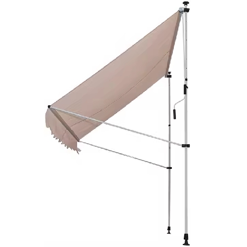 Store banne sans perçage brun clair : style chaleureux et ombrage extérieur fiable. Toile polyester 280 g/m², armature acier thermolaqué ou aluminium. Déperlant et anti-UV, idéal pour terrasse, balcon, café et cour.