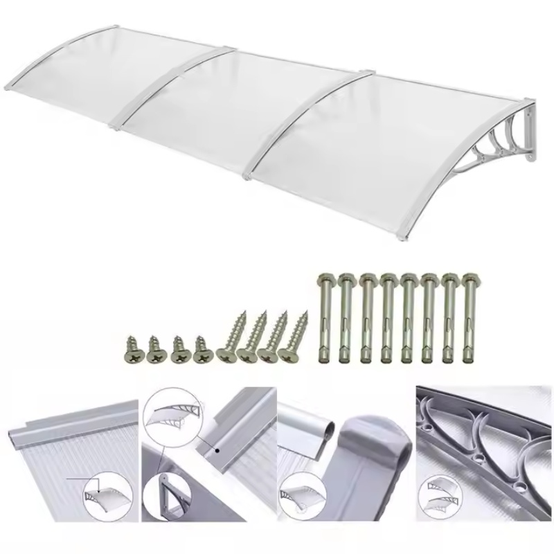 Cet auvent en polycarbonate blanc extra-large de 100 × 270 cm protège efficacement les grandes portes, les vitrines et les ensembles de plusieurs fenêtres. Fabriqué avec une plaque de polycarbonate de 5 mm traitée anti-UV et un cadre en aluminium inoxydable et ABS, il offre une protection fiable contre le soleil, la pluie, le vent et la neige toute l’année.