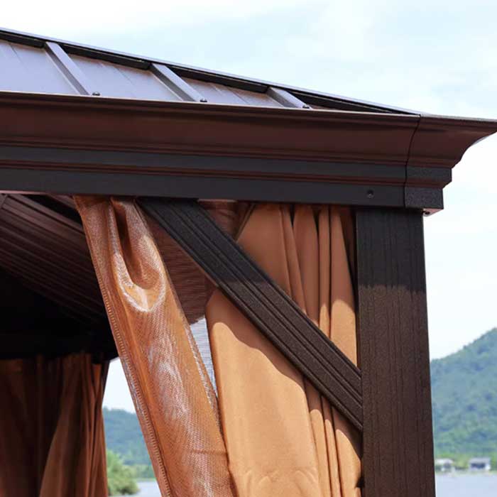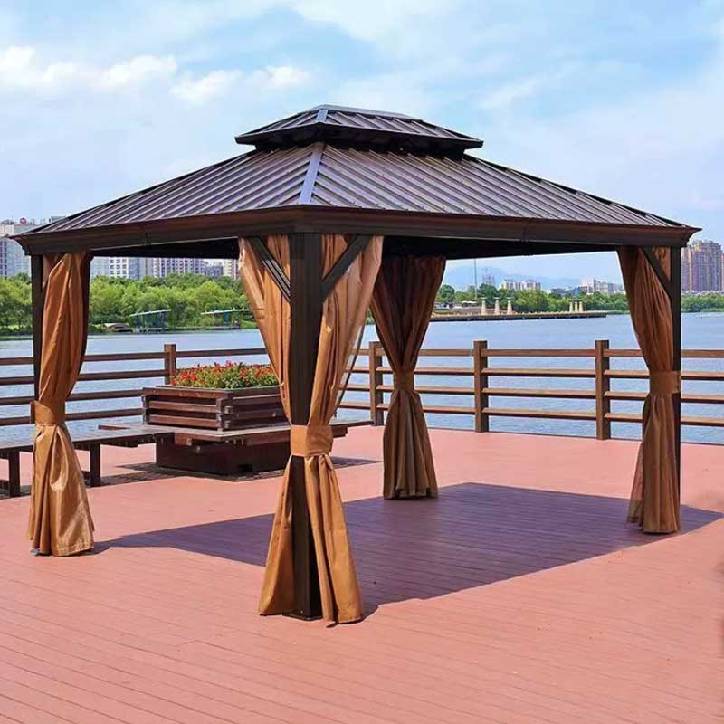Ce modèle combine solidité, usage pratique et design polyvalent. Il convient aux marques de mobilier outdoor, aux grossistes et aux revendeurs. Son toit en panneaux verticaux d’acier galvanisé apporte un style moderne tout en offrant une bonne durabilité, une résistance à la corrosion et une protection contre les intempéries. Le double toit améliore la ventilation et rend l’espace plus frais.