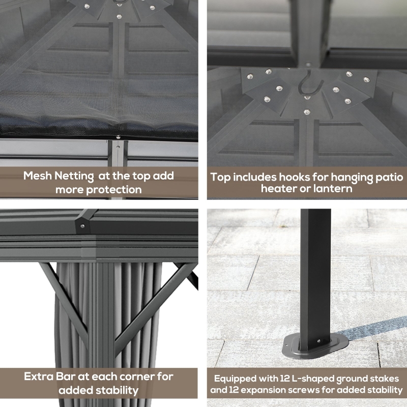 Un crochet de suspension intégré au centre (capacité jusqu’à 27 kg) permet d’accrocher un éclairage ou une décoration, pour une ambiance plus chaleureuse. La tonnelle est aussi équipée de quatre panneaux de moustiquaire zippée, pour un espace sans insectes tout en gardant une excellente ventilation. Les panneaux en maille sont résistants aux flammes et disposent de zips double face pour un accès simple et plus sûr.