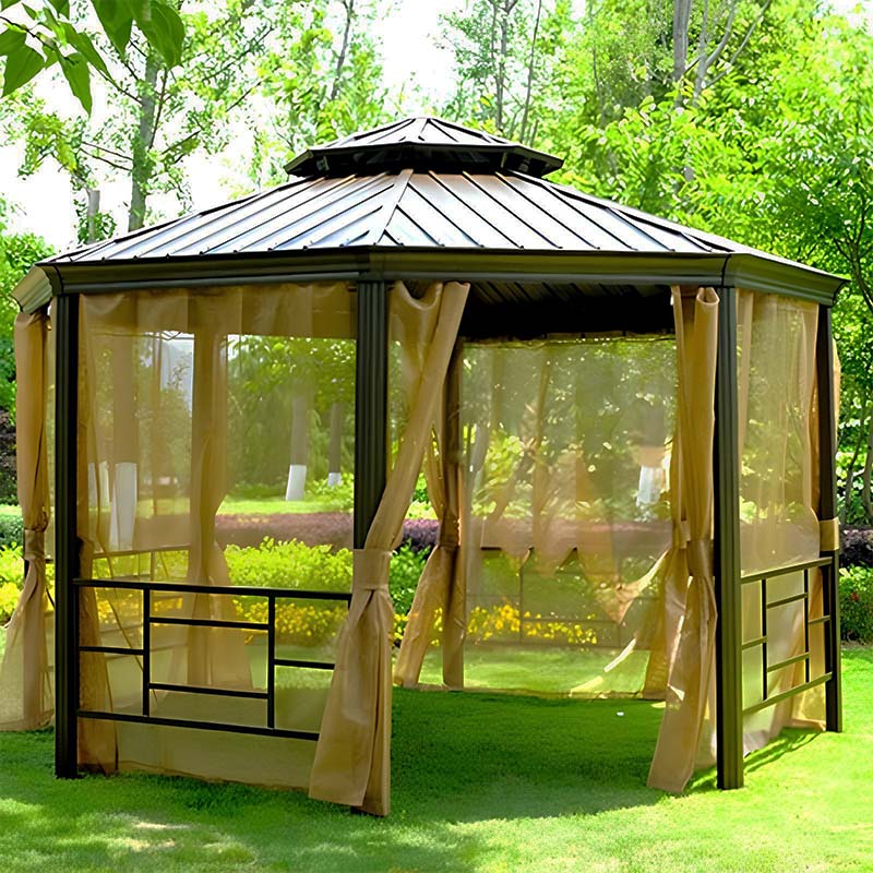 Équipée de rideaux latéraux étanches (polyester 180G avec protection UV) et d’une moustiquaire (tissu Teslin 270 avec fermetures éclair en résine 8#), cette tonnelle offre intimité, protection contre les insectes et résistance aux intempéries, créant un espace extérieur confortable. Le design octogonal, inspiré des pavillons traditionnels chinois, ajoute une touche de sophistication et d’élégance culturelle aux jardins, terrasses et resorts.