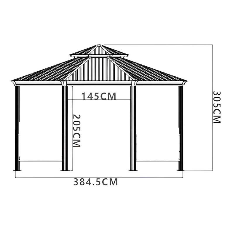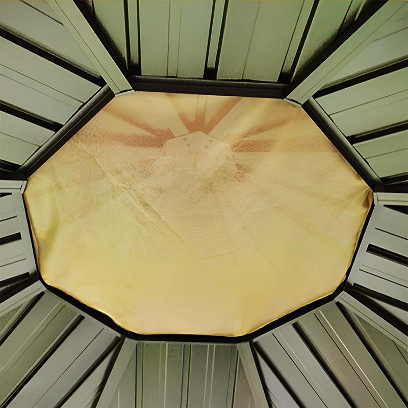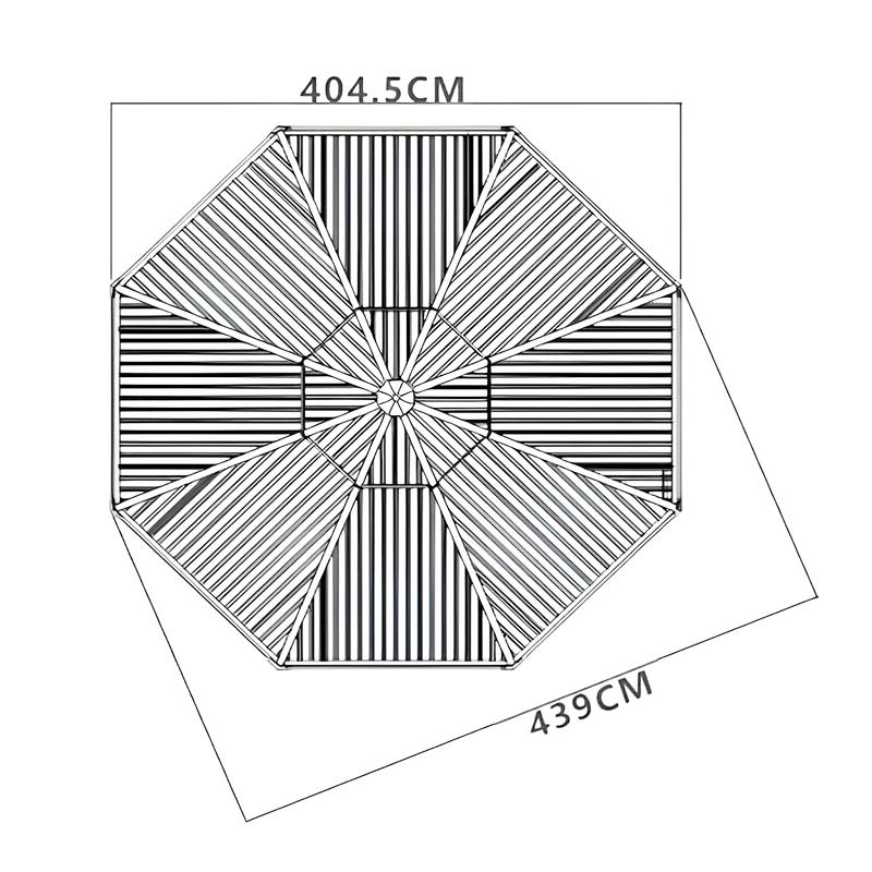 La tonnelle octogonale 4m (diagonale) avec toit double en acier galvanisé allie le charme architectural traditionnel chinois aux matériaux modernes, créant une structure extérieure élégante et durable. Le toit double en acier galvanisé (épaisseur 0,6 mm) améliore la circulation de l’air et offre une protection supérieure contre la pluie, le soleil et le vent.