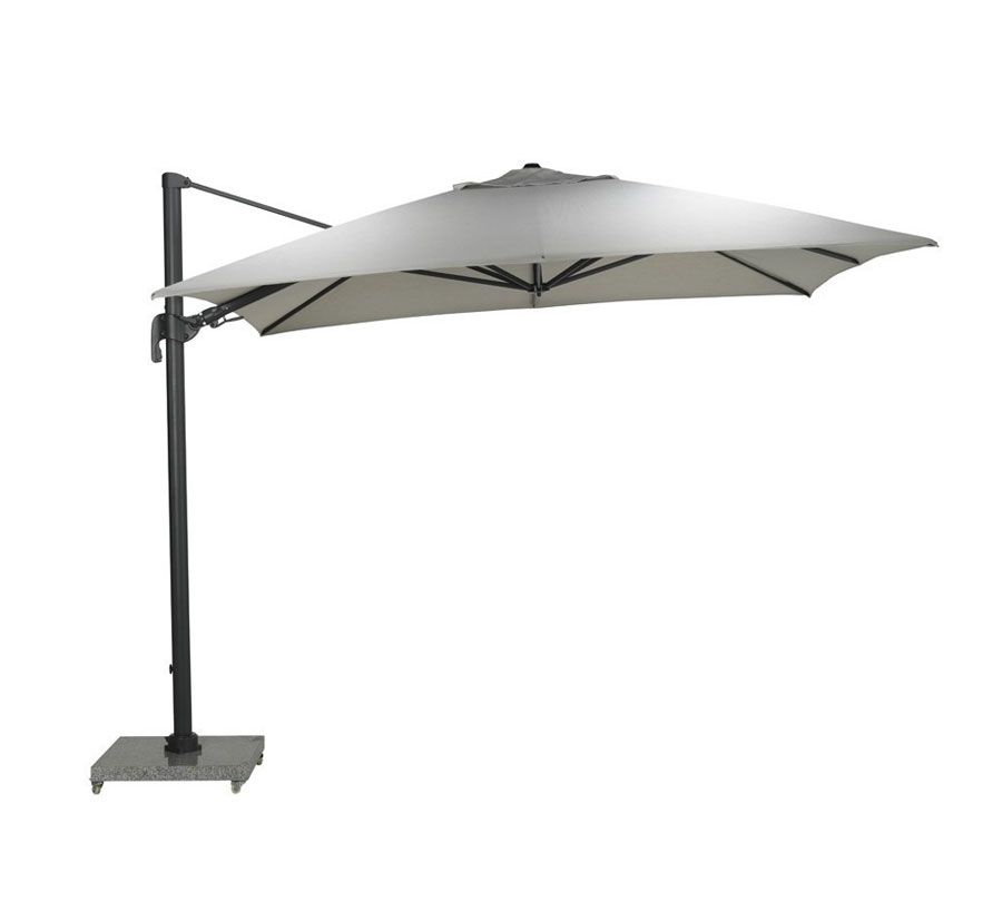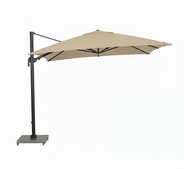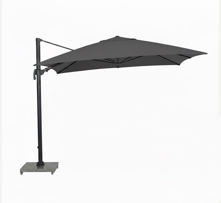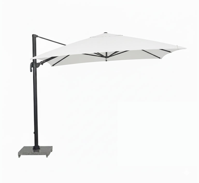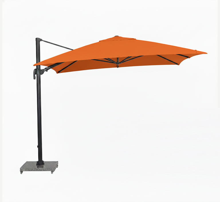The Cantilever Offset Parasol Umbrella, model UM03, is designed to deliver top-notch weather and UV protection. Its canopy is made from 220G solution-dyed polyester fabric, offering excellent fade resistance for up to 1000 UV hours and effective water repellency to withstand changing weather conditions. The canopy includes an air vent to improve airflow and stability.