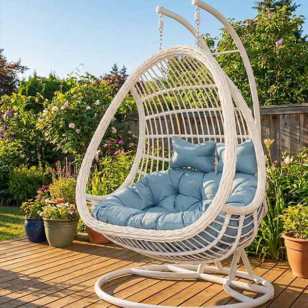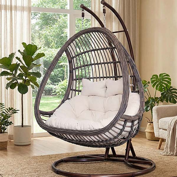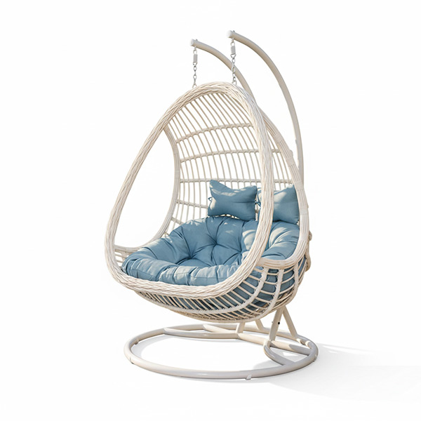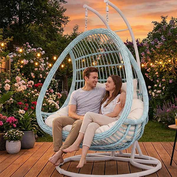 This classic double egg hanging swing chair is designed for two-person relaxation, featuring a sturdy metal structure, hand-woven synthetic rattan, and thick cushions that balance comfort and stability. Suitable for balconies, living areas, and various indoor or semi-outdoor spaces. Ideal for distributors, outdoor furniture brands, and project buyers. OEM & ODM services are available.