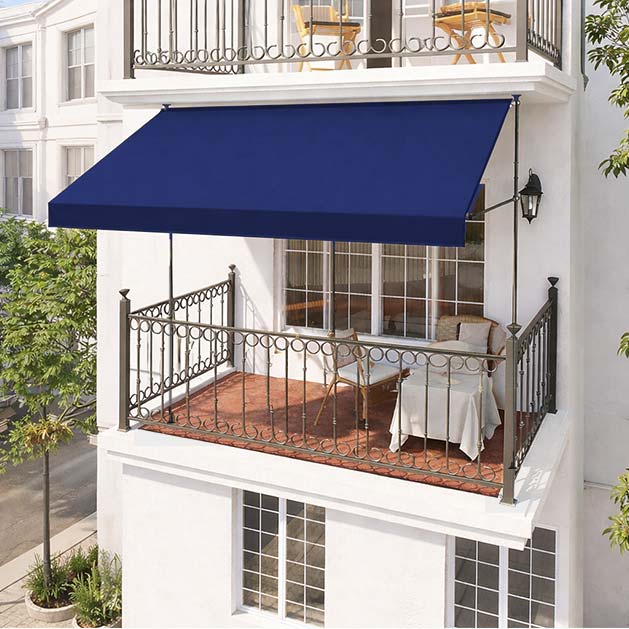 This blue clamp-awning offers cool shade and modern appeal without requiring wall installation. Crafted with 280gsm polyester fabric and a powder-coated steel or aluminum frame, it’s water-resistant, UV-protective, and perfect for patios, cafés, and balconies.