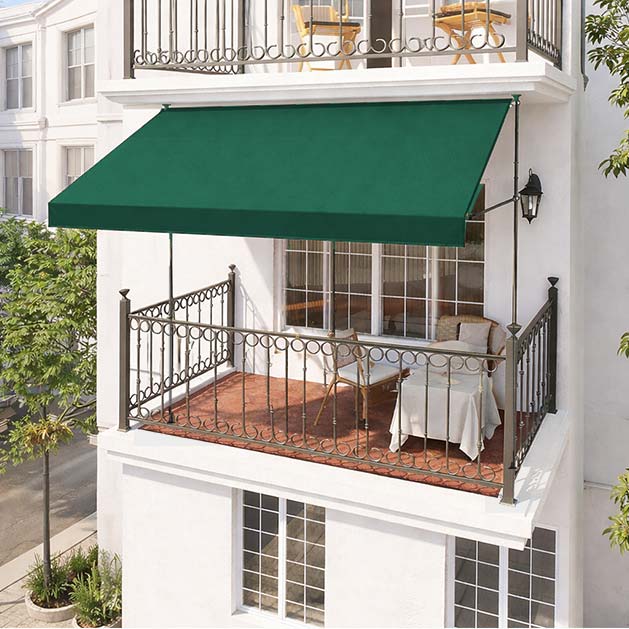 This green clamp awning offers reliable shade and weather protection with a nature-inspired look. Made from 280gsm polyester with PU or PA coating and supported by a powder-coated steel or aluminum frame, it’s ideal for patios, gardens, cafés, and more.