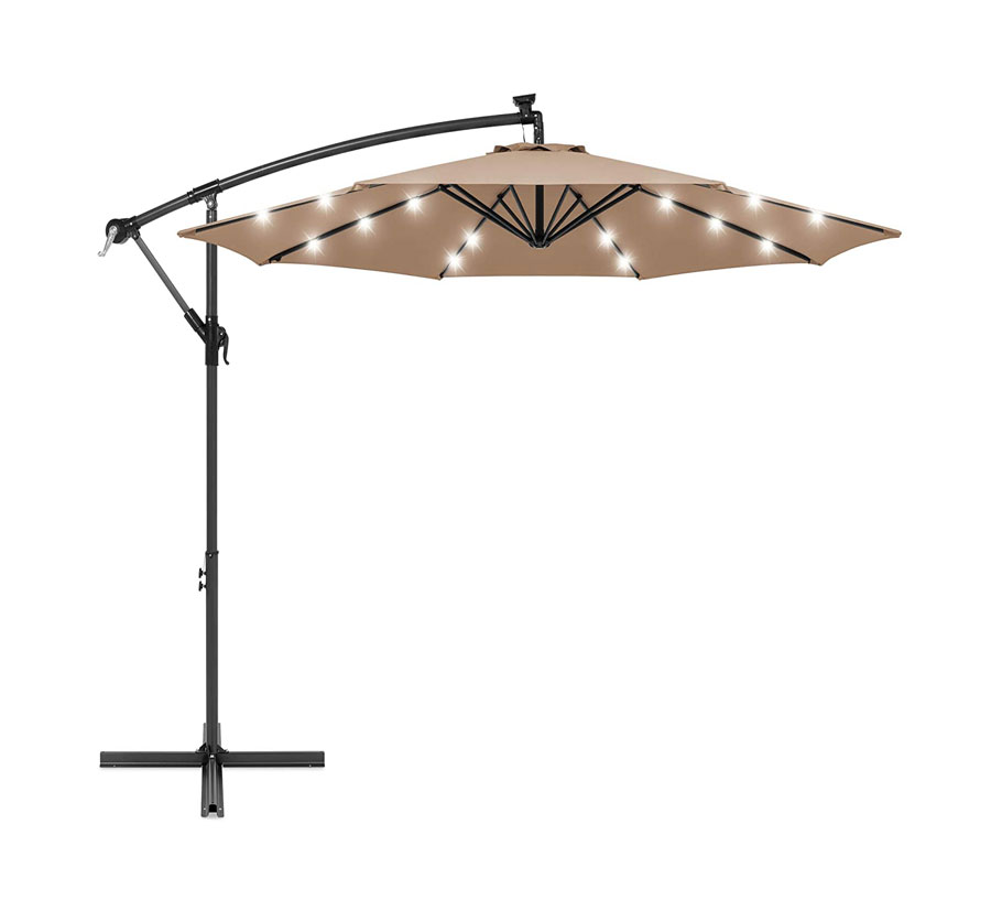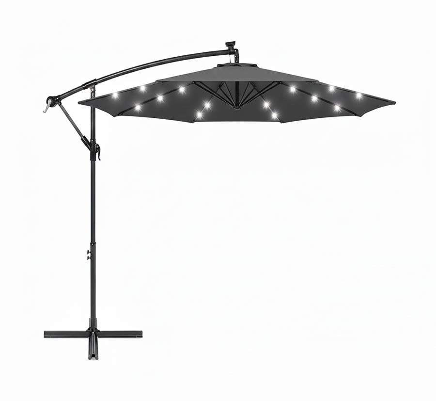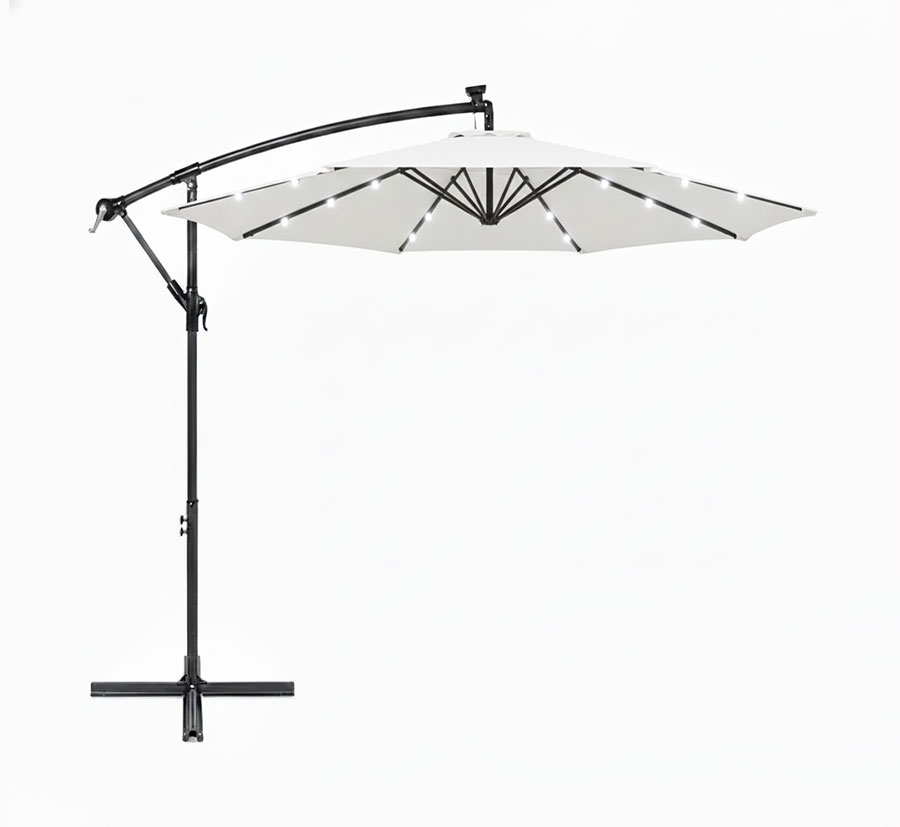 The UM07 10ft patio hanging solar LED umbrella provides ample shade with built-in LED lights, a durable steel frame, and an adjustable tilt mechanism. Perfect for outdoor events, parties, and business use.