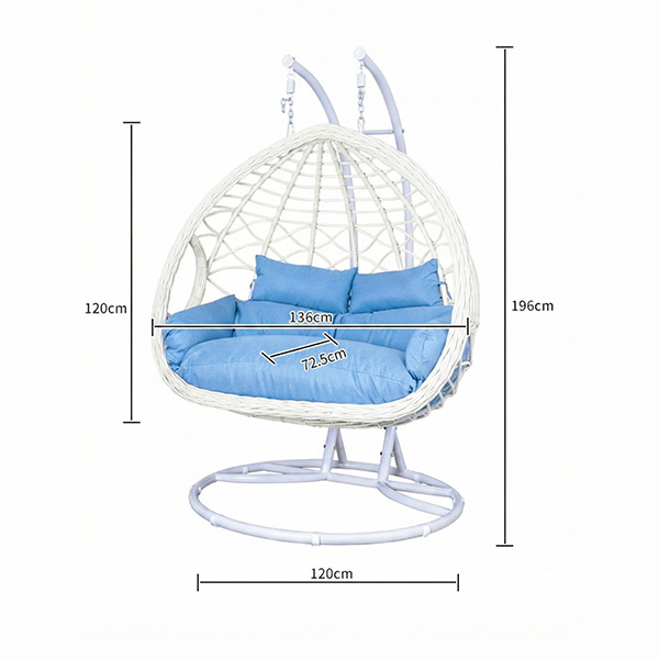The HSC-DE2-003 double egg hanging swing chair is designed to balance structural stability with a distinctive visual style. Its spacious egg-shaped seat comfortably accommodates two people, making it an ideal choice for patios, gardens, and balcony relaxation areas.