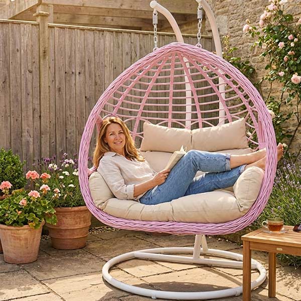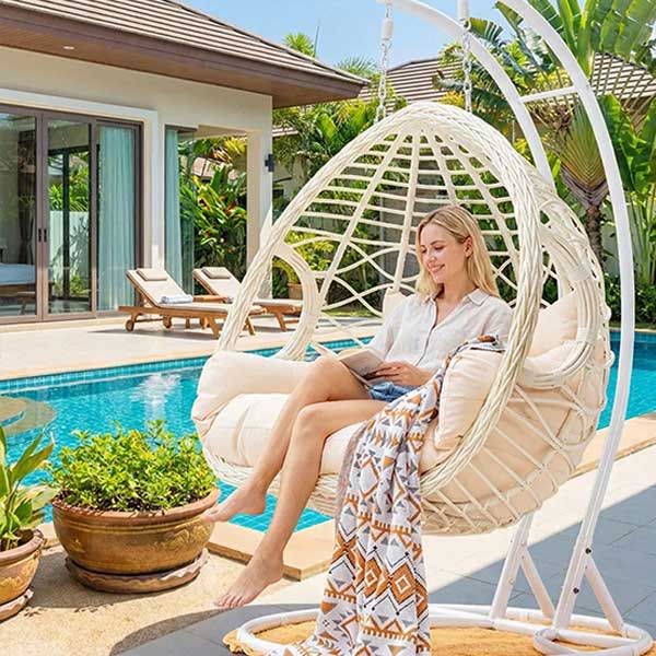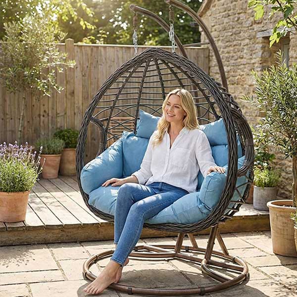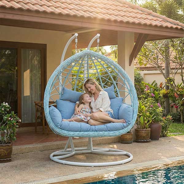 The widened double egg design provides ample space for two users. Thick cushions with separate pillows offer supportive comfort and a relaxed seating experience, making the chair suitable for lounging, reading, or casual conversation.